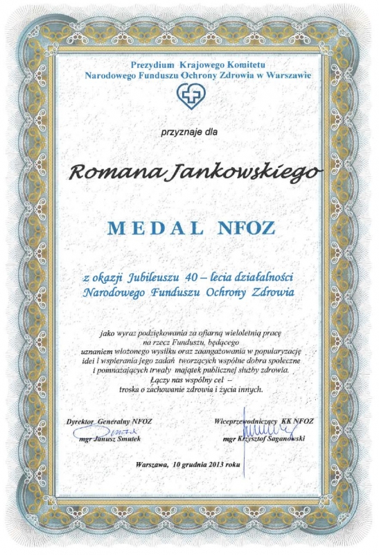Dnia 10 grudnia 2013 roku prof. UM dr hab. med. Roman Jankowski otrzymał nagrodę za działalność charytatywną - Medal NFOZ z okazji Jubileuszu 40-lecia działalności Narodowego Funduszu Ochrony Zdrowia przyznany przez Prezydium Krajowego Komitetu Narodowego Funduszu Ochrony Zdrowia w Warszawie.